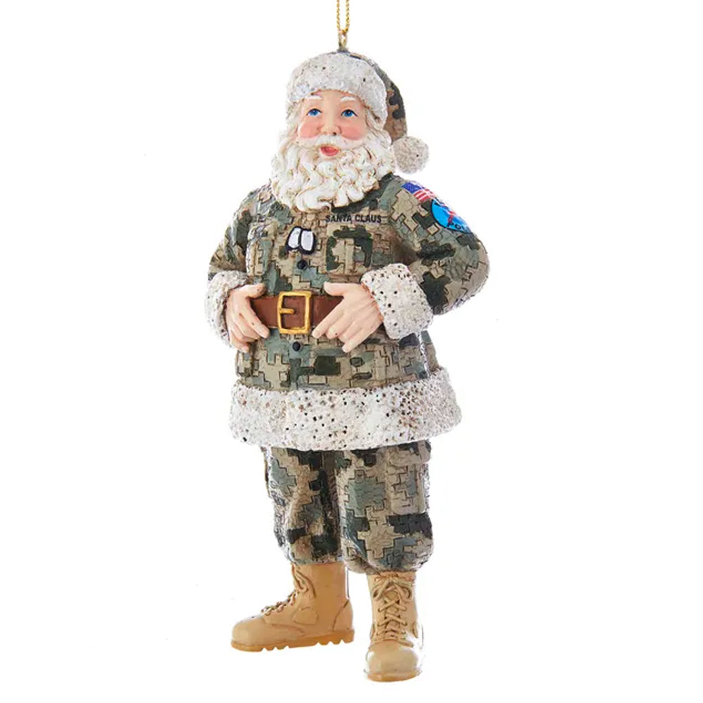 Celebrate the soldier in your family with the Camouflage Military Santa ornament. This ornament features Santa in a camouflage Santa suit and hat including combat boots, patches, dog tags and belt